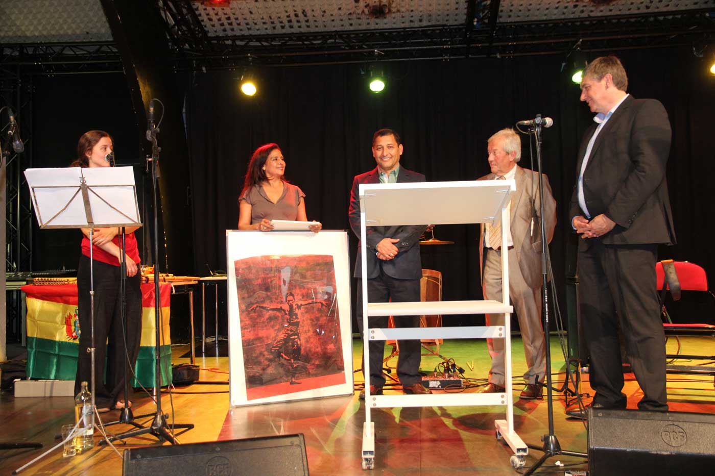 Tijdens de viering werd o.a. de burgemeester van Tarija Oscar Montes figuurlijk in de bloemen gezet met de overhandiging van een werk van Brasschaats kunstenaar Bruno Vekemans.
