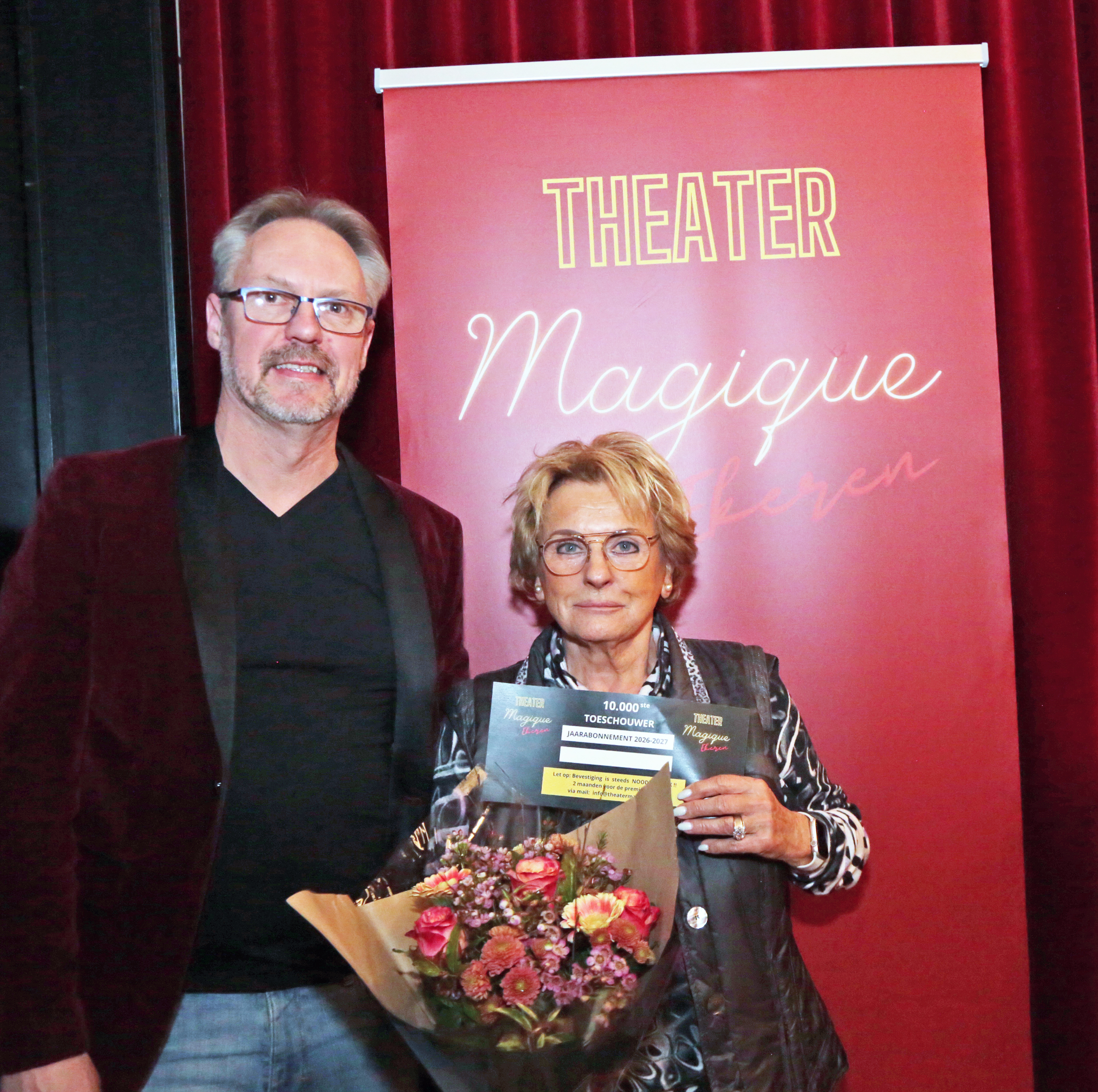 Bloemen en een jaarabonnement voor Brigitte Borms, de 10.000ste bezoeker aan Theater Magique.