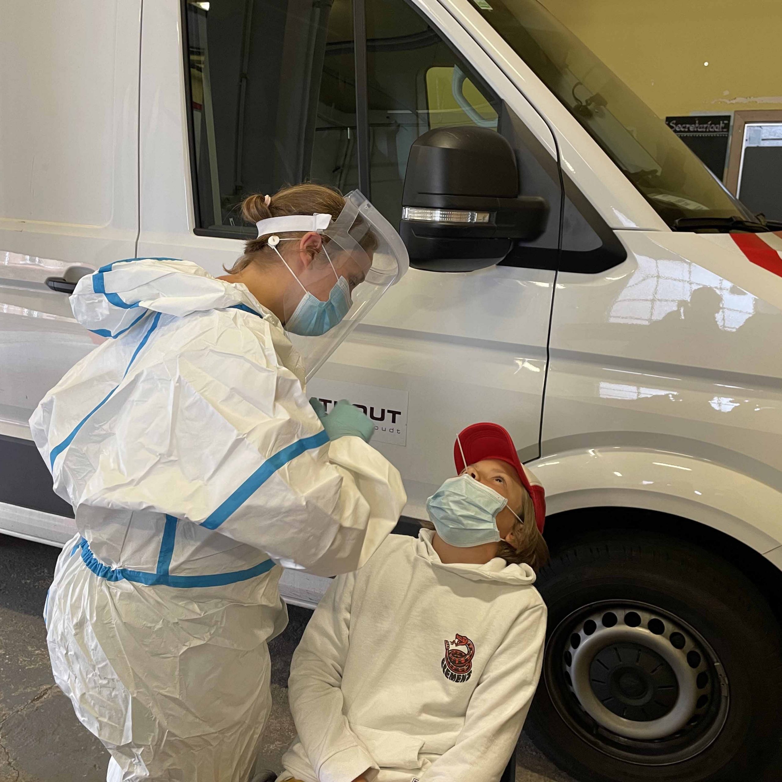 De 100.000ste PCR-afname werd symbolisch in de bloemetjes gezet. Het waren de broers Jules (16) en Matteo (12) Ghyoot uit Kalmthout die zich lieten testen. Ook hun vader Paul was erbij. Ze waren net terug van vakantie en werden daarom getest. “Cool.”, reageert Matteo verrast als hij de 100.000ste PCR-test krijgt. Zijn oudere broer Jules is dan weer vereerd. Vader Paul maakte van de gelegenheid gebruik om alle medewerkers te bedanken voor de vlotte organisatie.