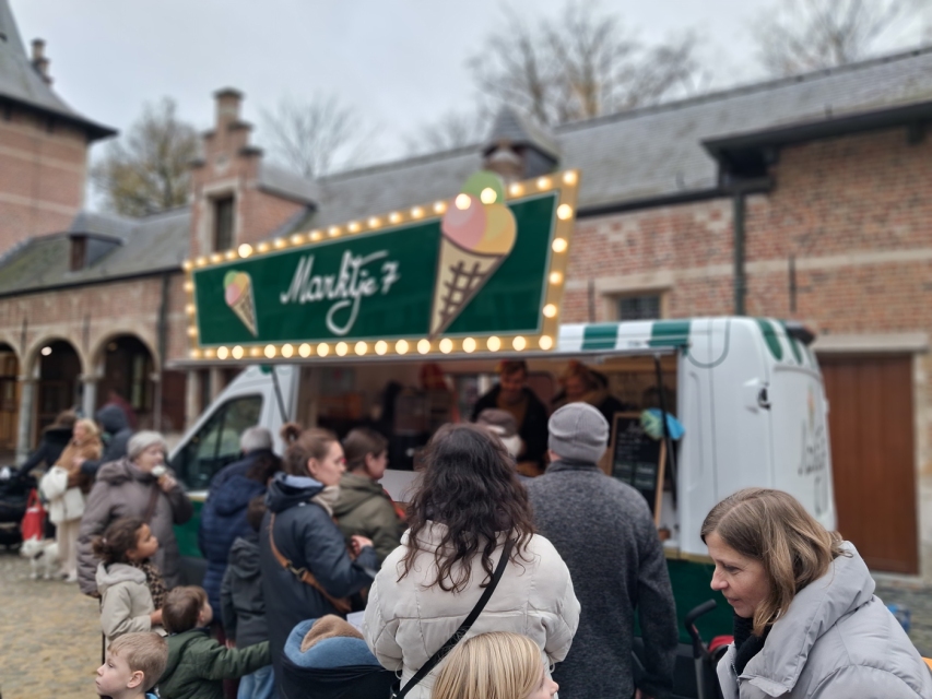 Gelukkig hadden de weergoden beslist om die géén regen te voorzien zodat de toestromende kinderen, ouders, grootouders en sympathisanten op het plein zich alleen tegen een frisse wind moesten beschermen, te meer omdat de Sint iets later dan voorzien op het plein verscheen. Geen mens die daar een probleem van maakte. De stoet zette zich in beweging, muziekband voorop gevolgd door Sinterklaas in zijn door paarden getrokken koets en trok, begeleid door politie te voet en per fiets, doorheen enkele straten richting Veltwijckpark waar het districtsbestuur een keurig verzorgde onthaalruimte had voorzien op het binnenplein van het kasteel.