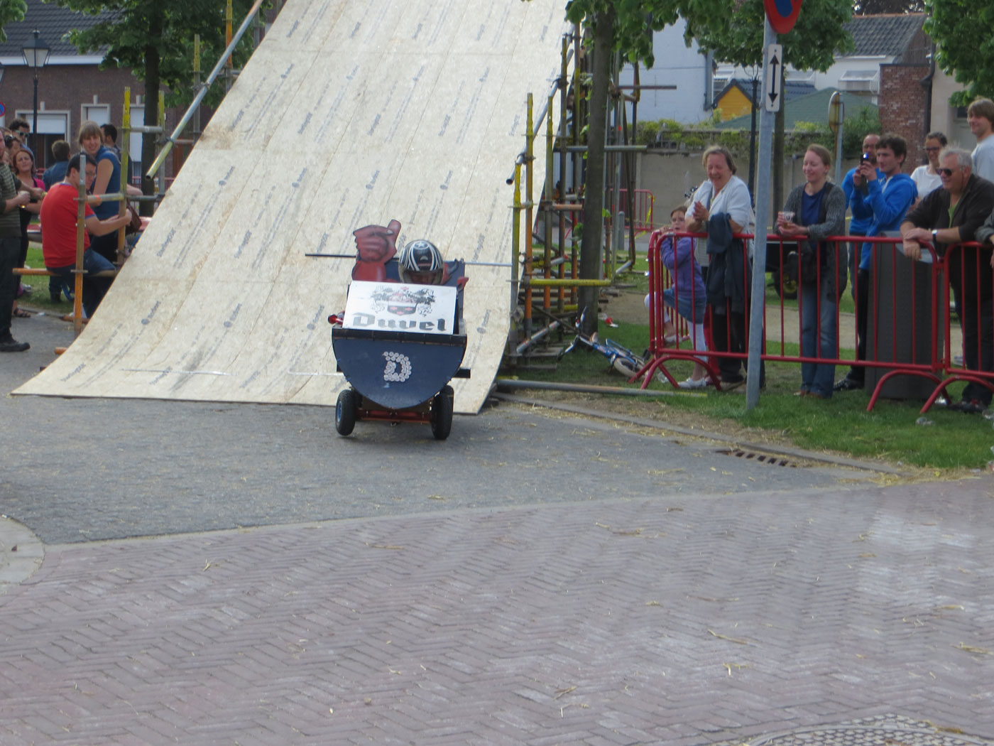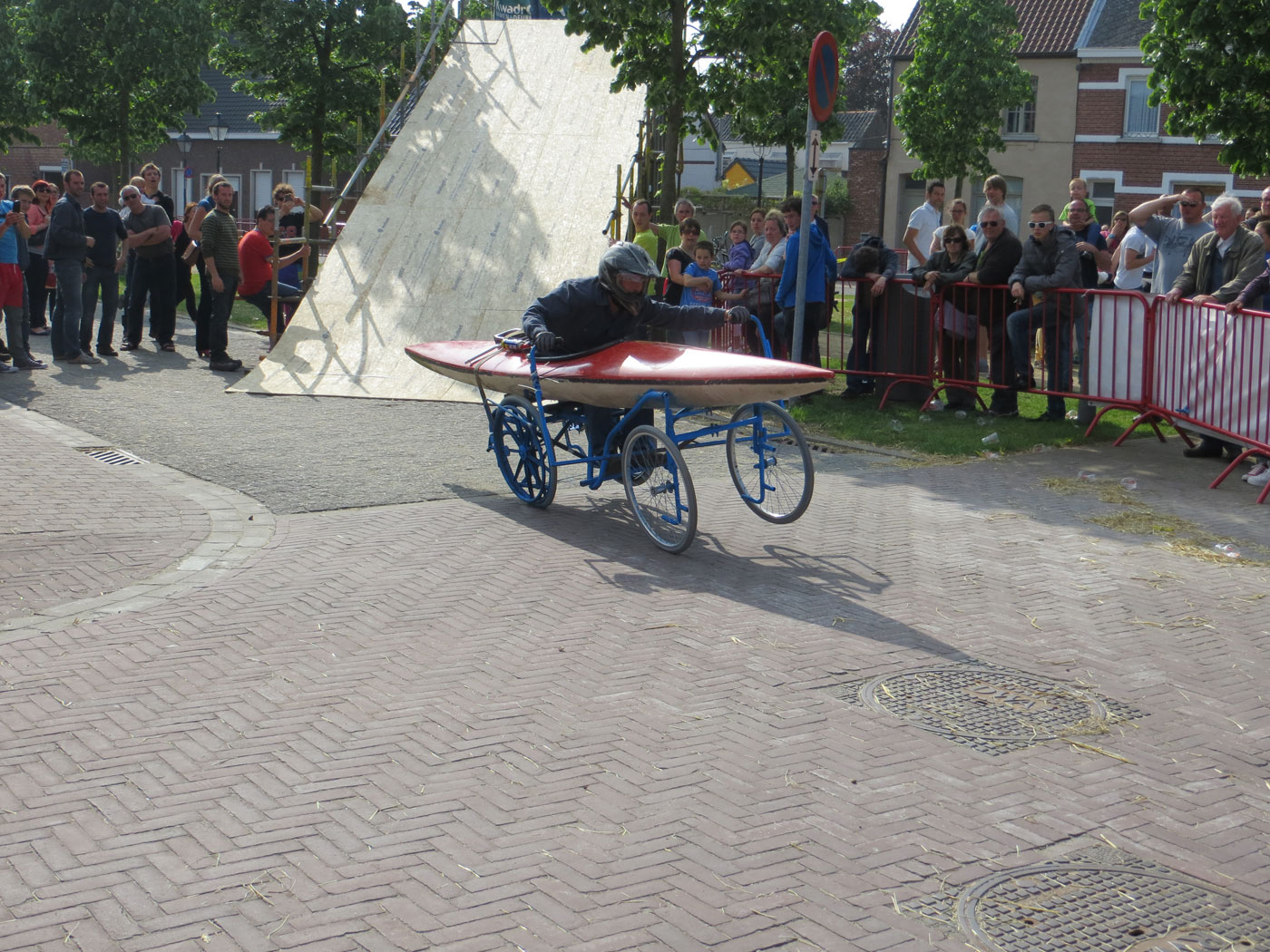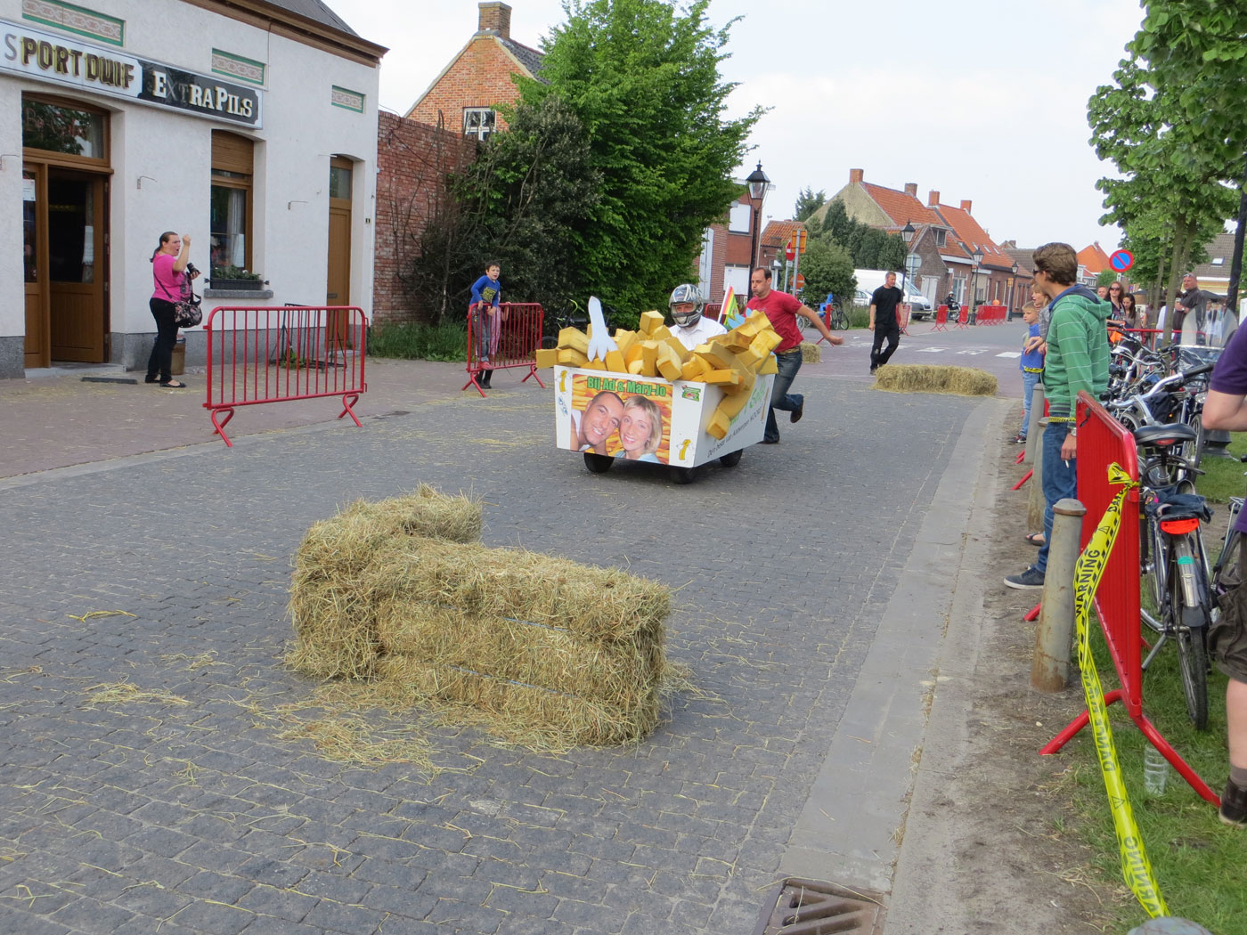 Na de officiële keuring startte omstreeks 15 uur de race. 13 karretjes, of hoe je het ook mag noemen, namen deel aan de wedstrijd. Van een schans van 4 meter hoog doken de vernuftige karretjes de wedstrijd in en moesten meteen een scherpe bocht aansnijden. Bij de een ging dat al wat vlotter dan bij de ander. Seppe Merveille nam een serieuze bocht en vlamde met zijn fiets tegen de strobalen aan de huisgevel. Met als resultaat een paar schrammen op de knieën, een kapotte broek en exit wedstrijd.