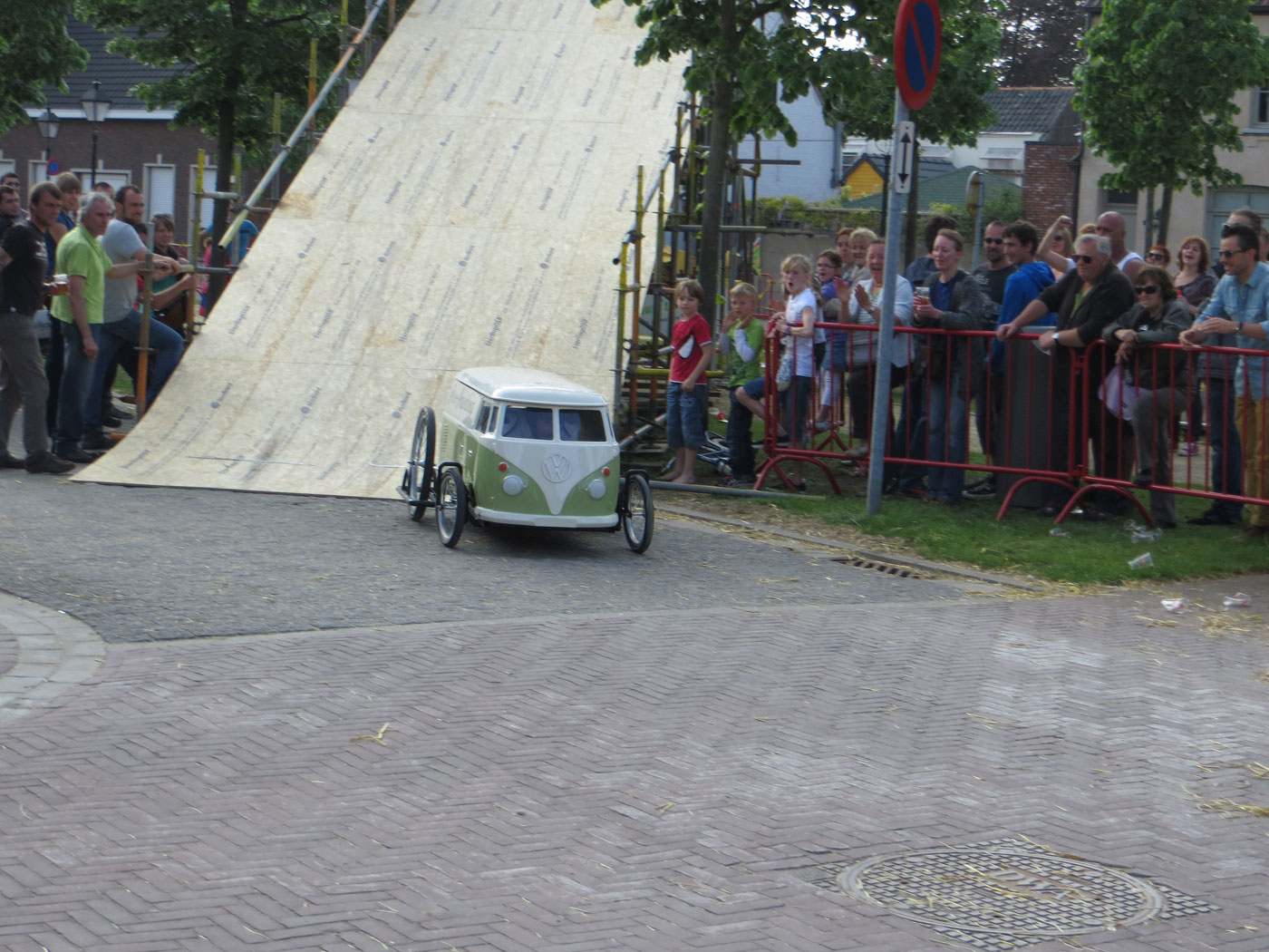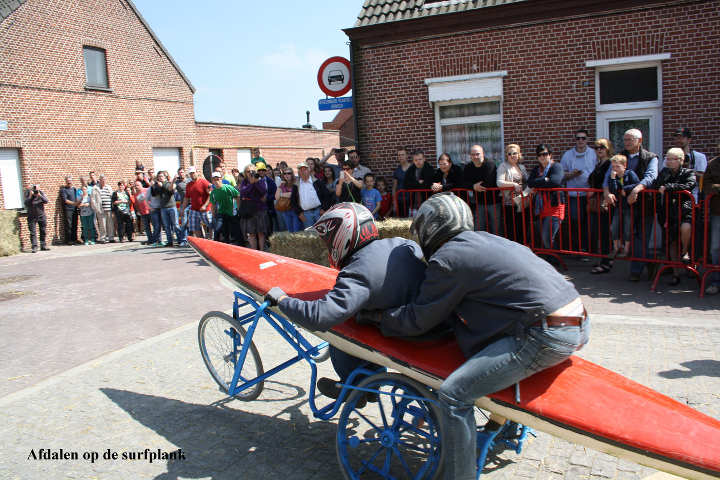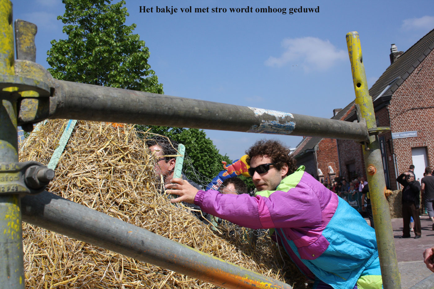 Na de officiële keuring startte omstreeks 15 uur de race. 13 karretjes, of hoe je het ook mag noemen, namen deel aan de wedstrijd. Van een schans van 4 meter hoog doken de vernuftige karretjes de wedstrijd in en moesten meteen een scherpe bocht aansnijden. Bij de een ging dat al wat vlotter dan bij de ander. Seppe Merveille nam een serieuze bocht en vlamde met zijn fiets tegen de strobalen aan de huisgevel. Met als resultaat een paar schrammen op de knieën, een kapotte broek en exit wedstrijd.