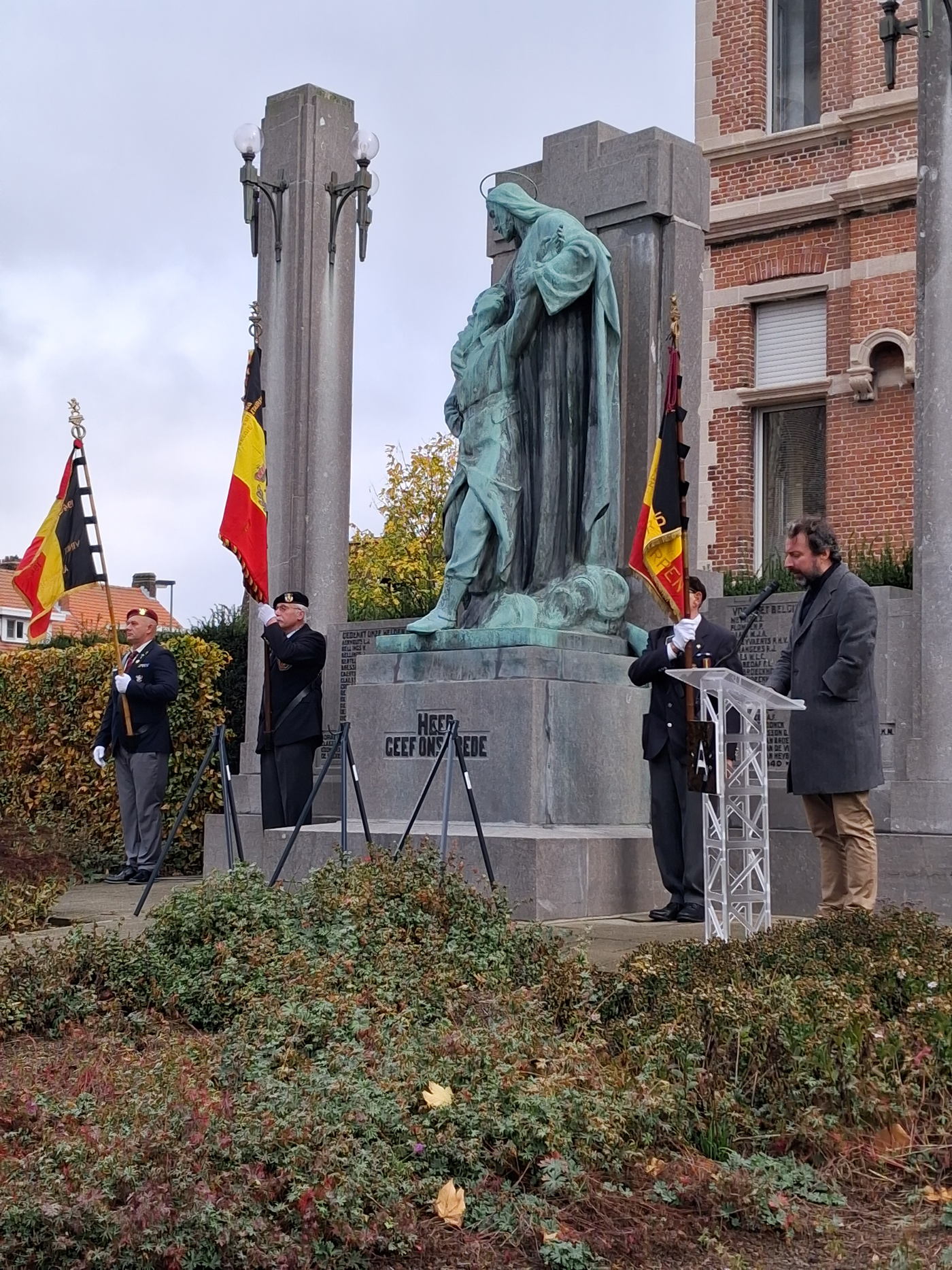 Districtsburgemeester Koen Palinckx herinnerde in zijn toespraak aan het feit dat zowat 6000 Belgische soldaten het leven lieten in WO I en ook aan de wil van iedereen toen, om na het beëindigen van de strijd, steeds voor vrede te willen gaan. Jammer genoeg bleek dat in 1940 ijdele hoop te zijn en ook nu is er opnieuw wapengeweld in vele regio’s, zelfs niet zo ver van ons land in Oekraïne. “Meer dan ooit zouden monumenten zoals het Ekerse een verwittiging moeten zijn en een streven naar blijvende vrede” aldus Palinckx. Hij bedankte de vele aanwezigen en zag in de grote groep aanwezige jongeren van Chiro Tempo een hoopvol teken voor de toekomst. Een vertegenwoordiger van hen benadrukte in zijn korte speech dat vrede vanuit de mensen zelf moet komen en riep op tot reflectie.