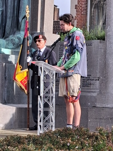 Districtsburgemeester Koen Palinckx herinnerde in zijn toespraak aan het feit dat zowat 6000 Belgische soldaten het leven lieten in WO I en ook aan de wil van iedereen toen, om na het beëindigen van de strijd, steeds voor vrede te willen gaan. Jammer genoeg bleek dat in 1940 ijdele hoop te zijn en ook nu is er opnieuw wapengeweld in vele regio’s, zelfs niet zo ver van ons land in Oekraïne. “Meer dan ooit zouden monumenten zoals het Ekerse een verwittiging moeten zijn en een streven naar blijvende vrede” aldus Palinckx. Hij bedankte de vele aanwezigen en zag in de grote groep aanwezige jongeren van Chiro Tempo een hoopvol teken voor de toekomst. Een vertegenwoordiger van hen benadrukte in zijn korte speech dat vrede vanuit de mensen zelf moet komen en riep op tot reflectie.