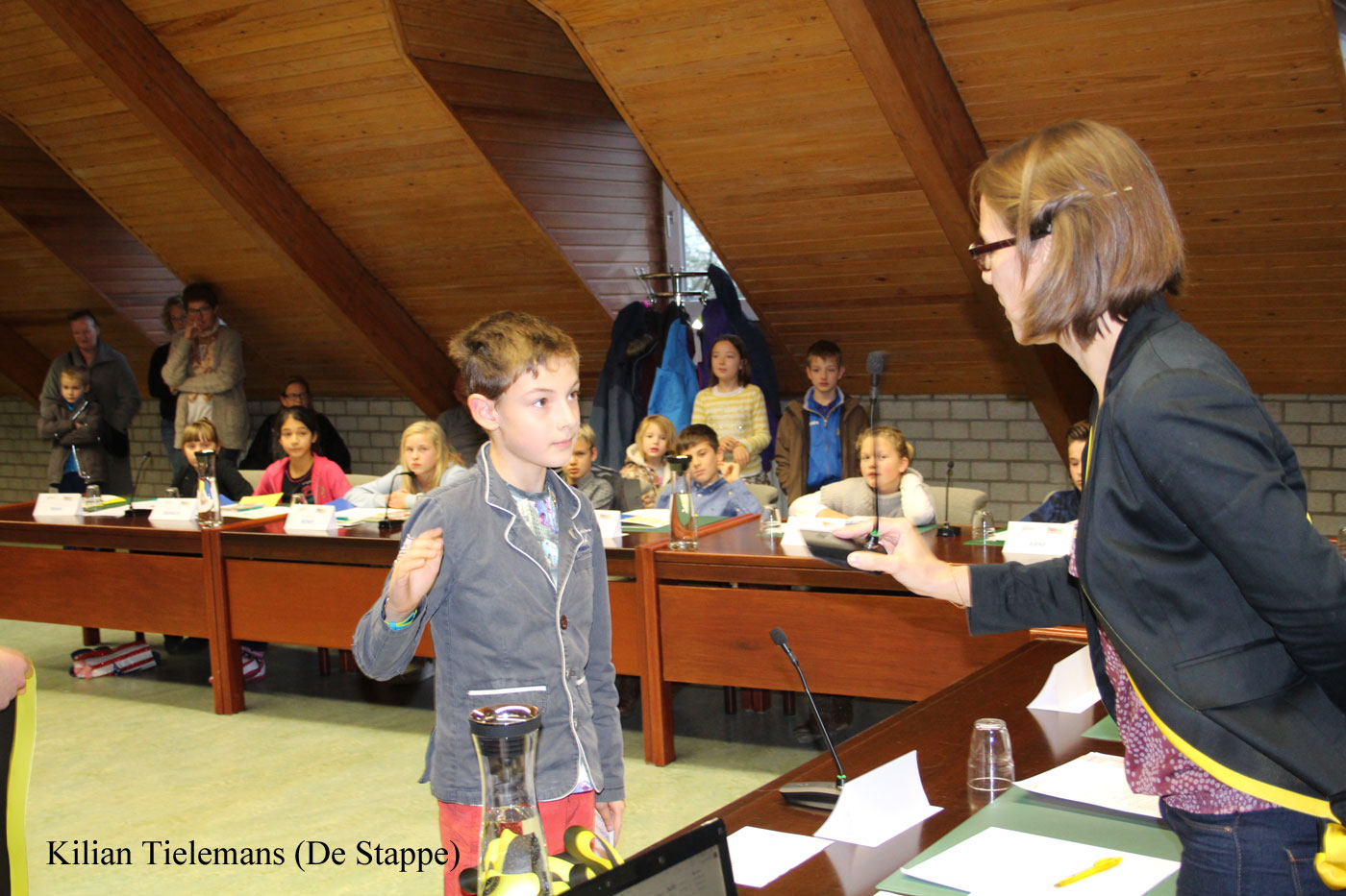 Vrijdag 27 november is de allereerste kindergemeenteraad geïnstalleerd in de gemeente Stabroek. 16 leerlingen van 4 scholen: Sint Catharina en De Stappe uit Stabroek en De Rekke en Sint Calasanz uit Hoevenen waren na een stemming voorgedragen om in de raad te zetelen. Schepen van onderwijs Veerle Nuyts was trots met deze mooie realisatie. Ze hoopt op een prima overeenkomst, mooie resultaten en een goed debat. Meester Sven van het eerste leerjaar van De Rekke stelde de kinderen voor. Meteen daarna kregen ze al een moeilijke taak voorgeschoteld: ze moesten een kinderburgemeester en – schepen kiezen. Sam Hemati (groene trui naast burgemeester) wordt de collega van burgemeester Rik Frans en Hanne Reeg (rechts naast Sam) zal de schepenambt op zich nemen.