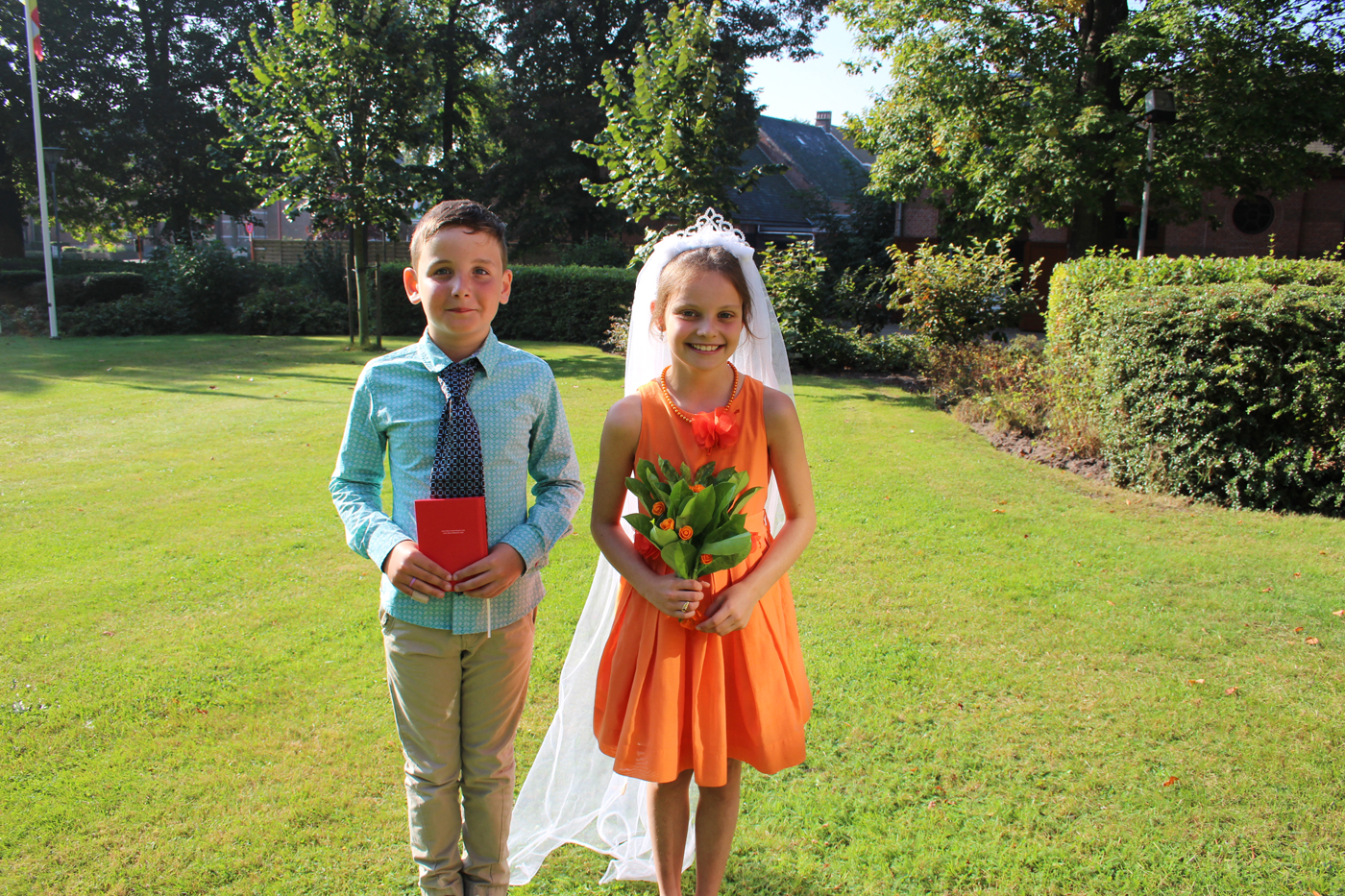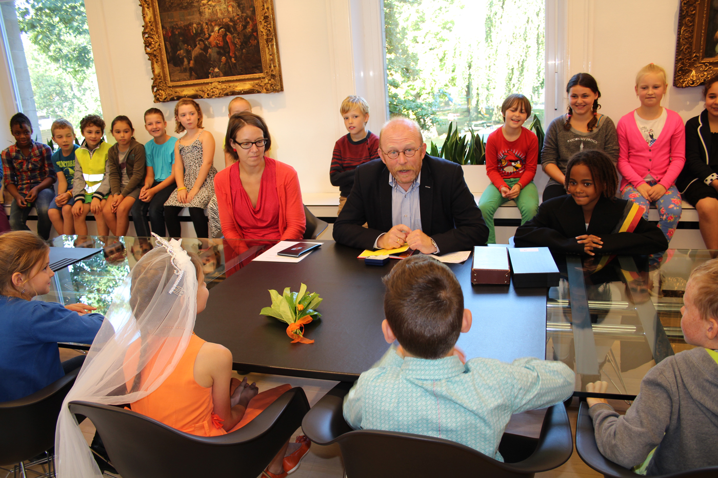 Nadien volgde een rondleiding door het gemeentehuis en woonden de leerlingen het kinderhuwelijk van hun klasgenootjes Arne Geenen en Lucca de Hoog bij. Het huwelijk werd plechtig ingezegend door burgemeesters Rik Frans en Kimberley en schepen Veerle Nuyts. Getuigen Clio en Luka zagen dat het goed was en zetten meteen hun handtekening in het trouwboekje. Na nog een stevige dikke knuffel ging het prille paartje met heel het gezelschap op de foto.