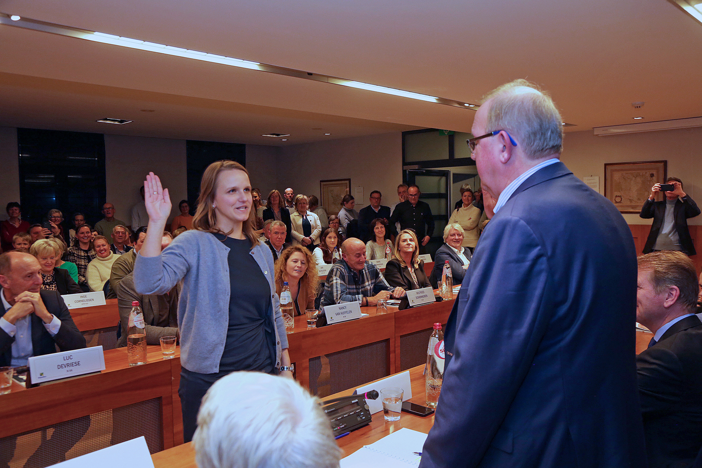 An Stokmans legde de eed af in handen van het oudste raadslid Johan Van Overveldt (N-VA).
