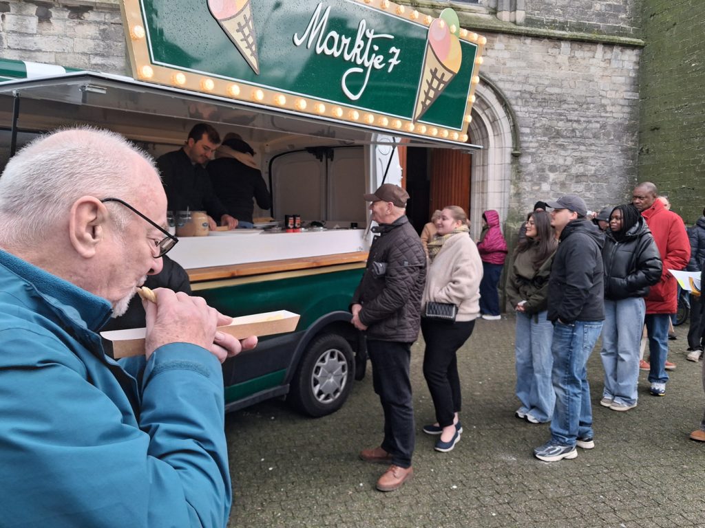 De foodtruck van Marktje 7 stond aan de uitgang van de kerk geposteerd en bood in plaats van de gebruikelijke Italiaanse gelato ambachtelijke pannenkoeken aan. Ver hoefden Loes en Tom niet te rijden want hun zaak bevindt zich pal tegenover de kerk. Overigens start de halfjaarlijkse raamverkoop bij Marktje 7 opnieuw op 4 april. Vanaf dan worden weer gelato in allerlei smaken, pannenkoeken en drankjes aan de man/vrouw gebracht en staat er een feestweekend op het programma aan kasteel de Gulden Poort. (jdh)