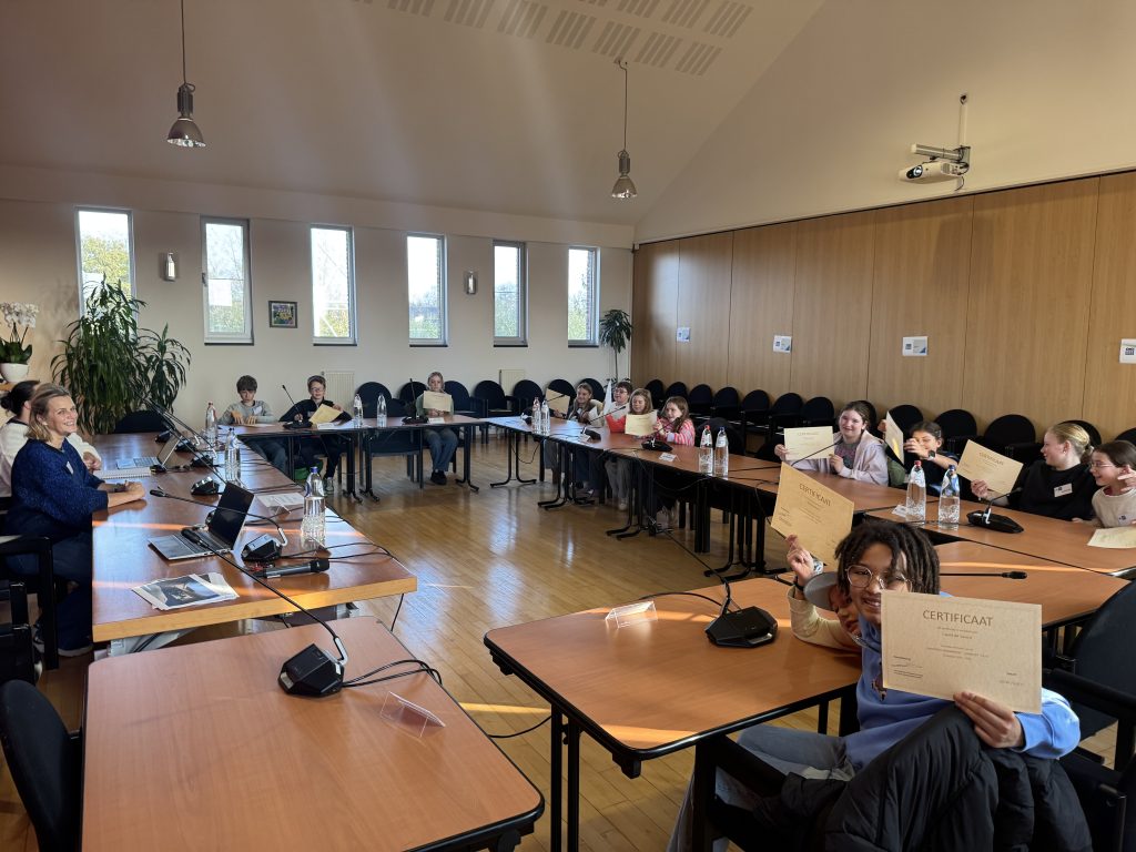 De vergadering begon met een officieel moment: de jonge raadsleden legden de eed af als vertegenwoordigers van de kinderen in het district. Vervolgens overhandigde voorzitter van de districtsraad, Jill Elst (N-VA), hen een certificaat als bewijs van hun nieuwe rol.