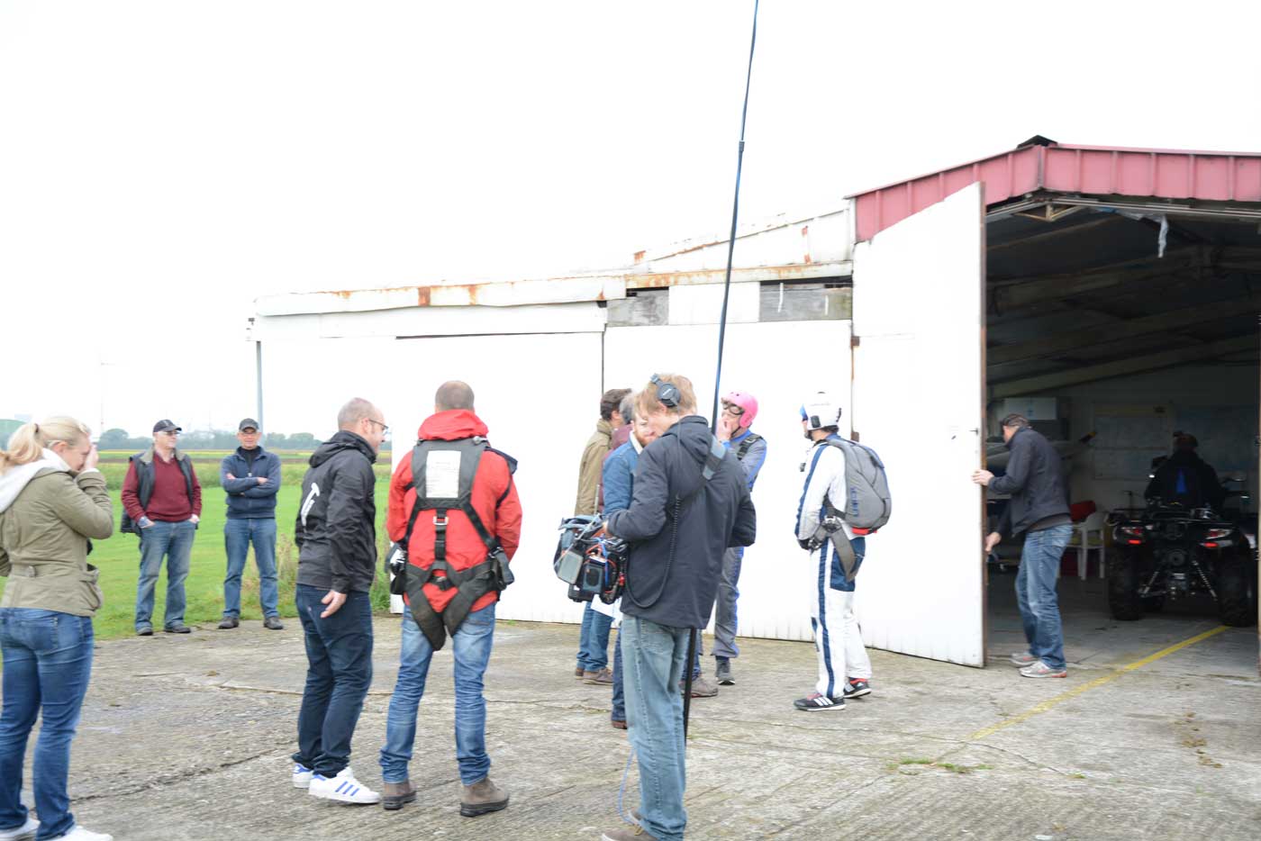Louis Van Den Weyngaert (72), Bruno Vleminckx (47) en Chris Vande Velde (43) van de parachutistenclub zijn op het vliegveld ook van de partij. Hen is gevraagd om de filmploeg bij te staan bij de scènes van het valschermspringen.