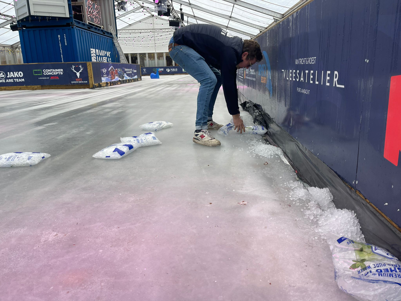 Om de ijsbaan operationeel te houden, zijn de voorbije dagen ingrijpende extra maatregelen genomen. Zo werd er gisteren meer dan 500 kilogram crushed ice aangevoerd om de randen van de baan te versterken en warmte-invloeden te beperken. Daarnaast wordt extra isolatie aangebracht en draait het technische team dag en nacht om de ijslaag in optimale staat te houden.